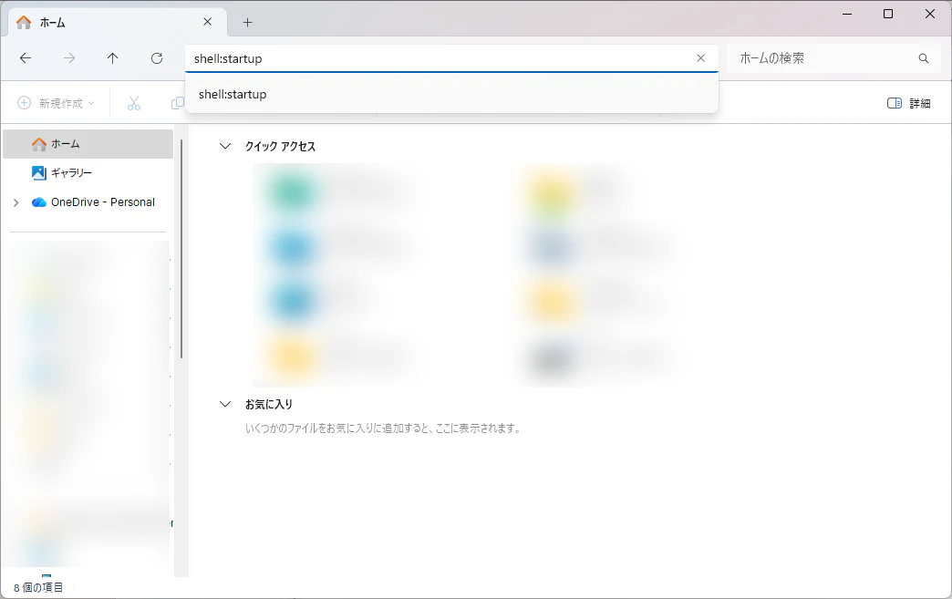 スタートアップフォルダは、エクスプローラーのアドレスバーに shell:startup